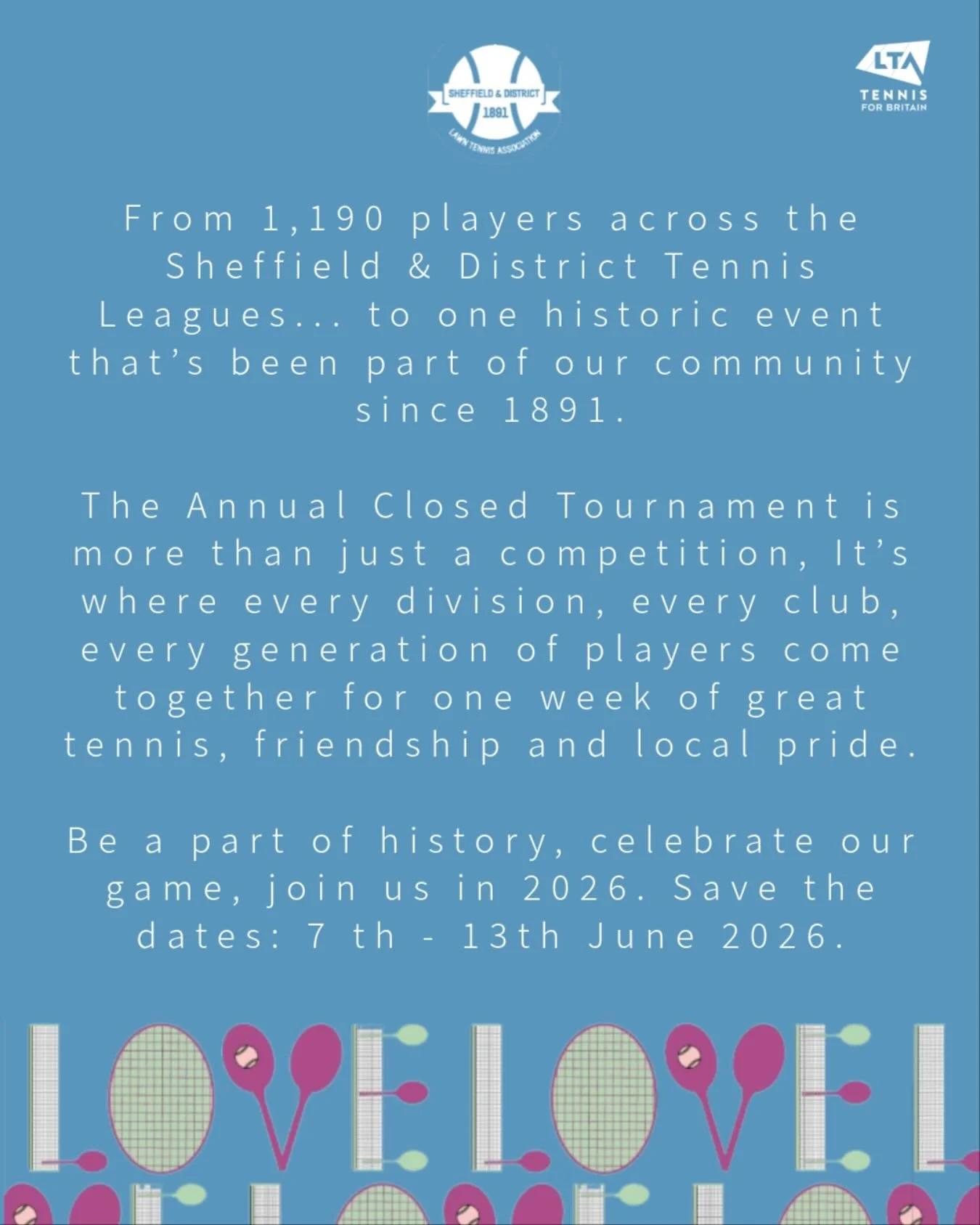 This years' tournament will be hosted by Beauchief Tennis Club with backup courts provided by Graves Tennis Club in case of bad weather.